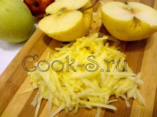 Приготовление яблочной начинки: яблоки натереть на тёрке, предварительно удалив сердцевину с семенами. Если ваши яблоки имеют жёсткую кожицу – от неё также лучше избавиться.