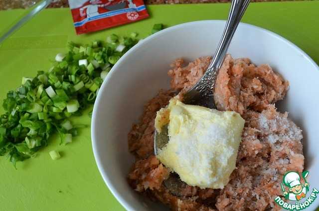 Филе нерки, сало и лук измельчить на мясорубке через мелкую решетку. Можно взять готовый фарш.