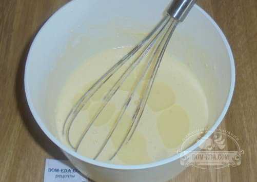 Основная проблема, с которой многие сталкиваются – это прилипание блинов к сковороде. Поэтому налейте 50 мл подсолнечного масла в жидкую основу и перемешайте.