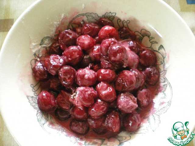 Вишню нужно разморозить, слить сок, смешать вишню с сахаром и крахмалом.