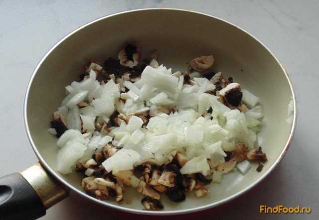 Тем временем чистим и моем репчатый лук. Затем нарезаем и добавляем на сковородку к шампиньонам. Тушим грибы с луком до готовности.