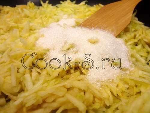 Переложить тёртые яблоки на сковороду, добавить сахар и протушить их 3-4 минуты до размягчения.
