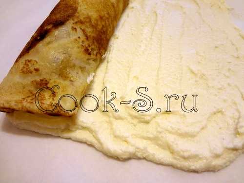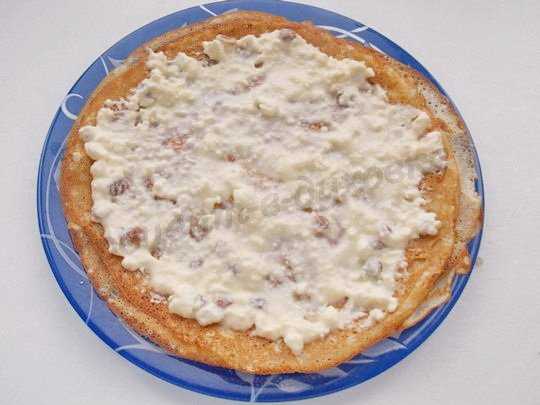 Готовые блинчики смазываем творожной начинкой, ложки по 3-3,5 столовых на каждый.