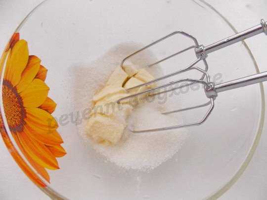 А тем временем готовим начинку. Размягчённое сливочное масло взбиваем миксером с сахаром до кремообразной массы.