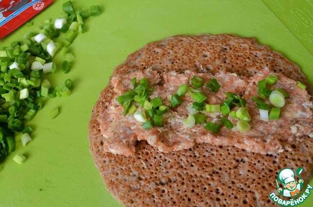 На остывший блин выложить 1 ст. л. фарша, рубленный зеленый лук,