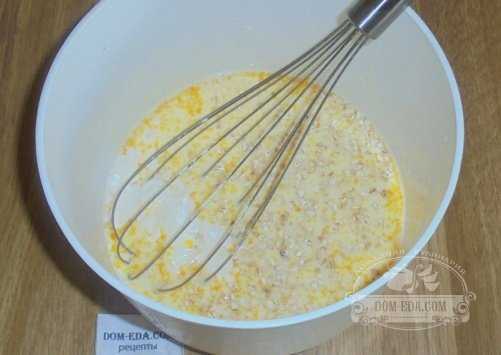 Сухие овсяные хлопья насыпать в смесь и размешать до однородности. Можно добавлять отруби.