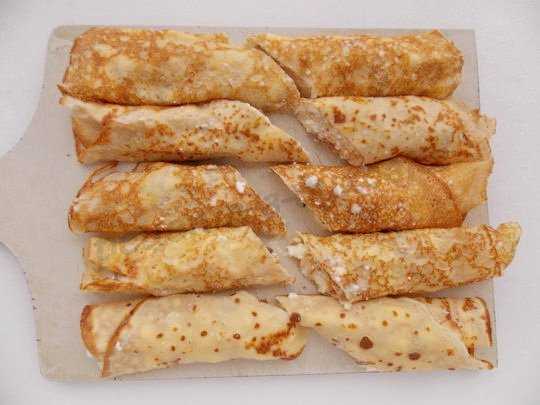 И сворачиваем блинчики рулетиками. Каждый рулетик разрезаем на две части посередине, наискосок.