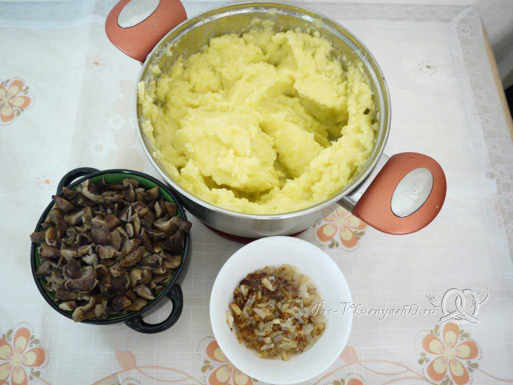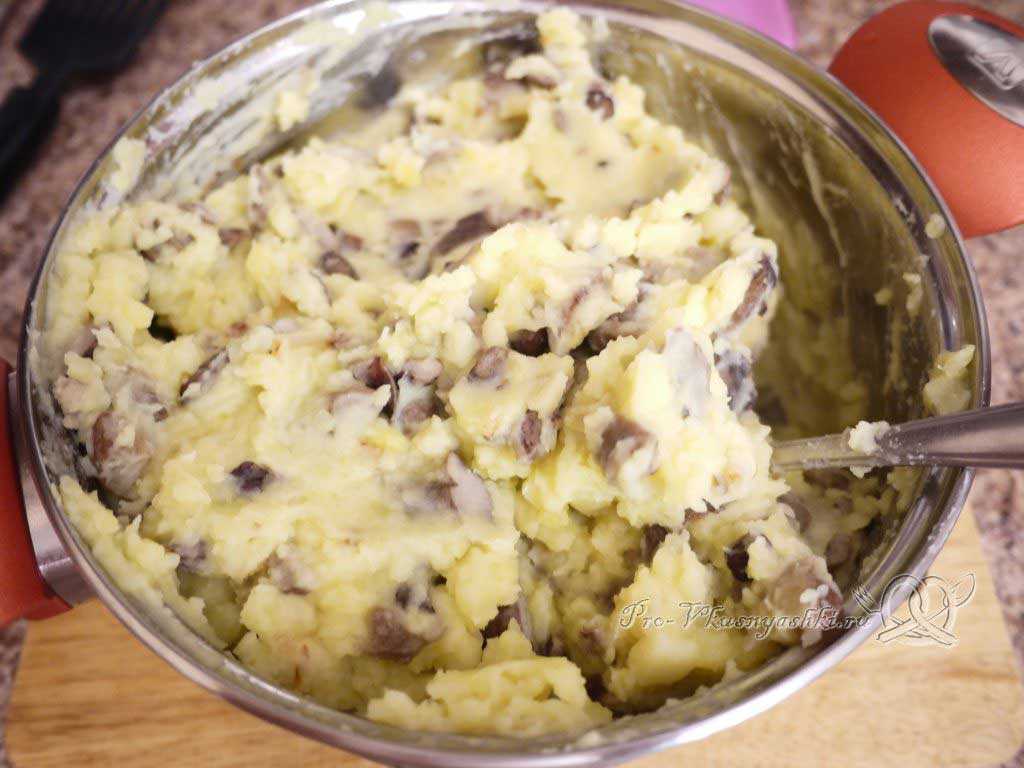 Соединяем картофельное пюре, жаренные грибы и лук. Перемешиваем, солим по вкусу.