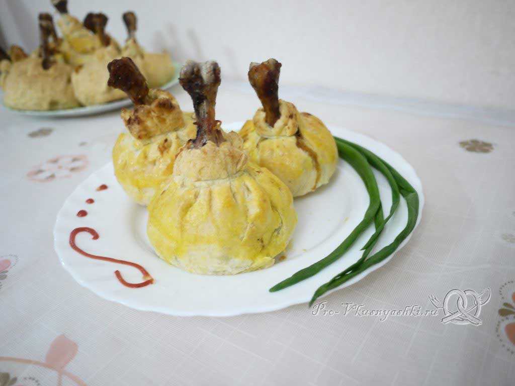 - Далее сформовать мешочки, перевязать луковым пером, переложить на сервировочное блюдо.