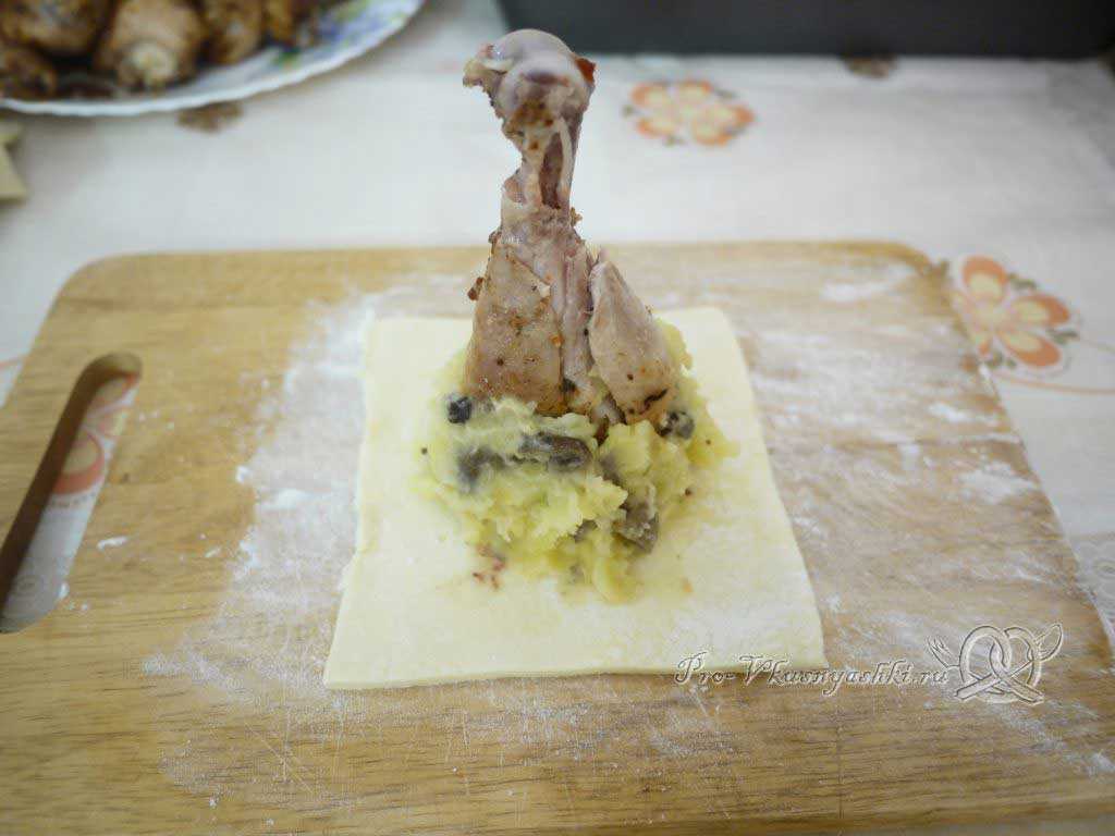 Этот рецепт полностью повторяет предыдущий, единственное отличие – мы возьмем чуть меньше куриного филе, примерно 250-300 г, и добавим к нашей начинке столько же консервированных или свежих шампиньонов, обжарив их на сковороде вместе с репчатым луком.