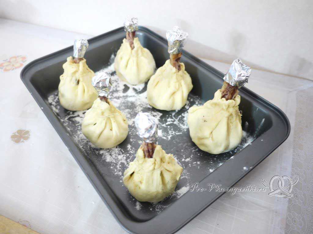 - Собрать в мешочек, сколоть зубочисткой, присыпать верх куркумой и выдержать в холодильнике два часа.