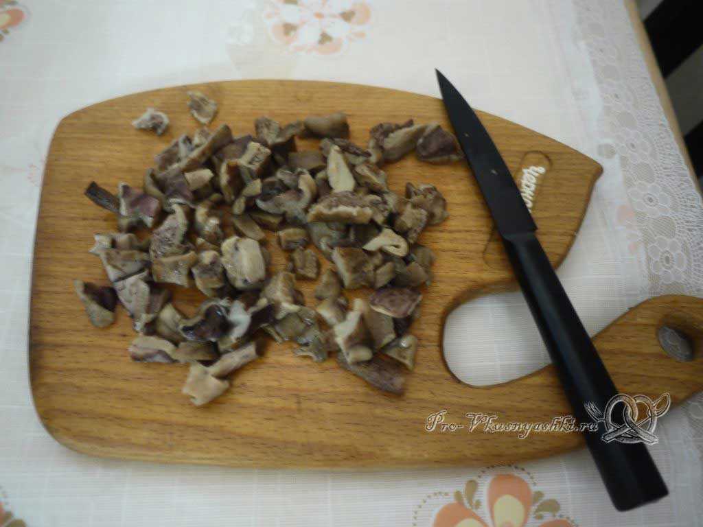 - Мясо обмыть, промокнуть салфеткой, нарезать кубиками.