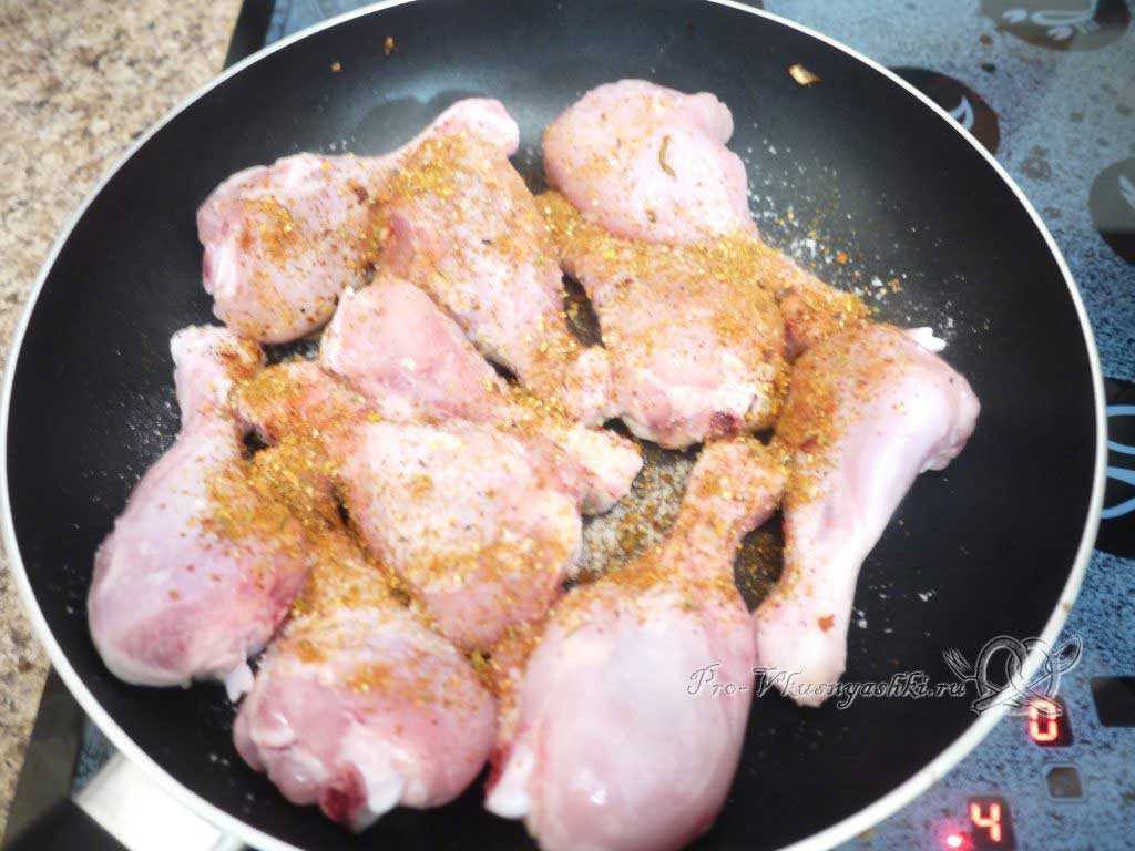 Параллельно обжариваем куриные голени (около 30 мин), посыпанные солью и специями по вкусу (подсолнечное масло для жарки я не добавляю) до готовности (мясо легко протыкается вилкой, с выделением прозрачного сока).