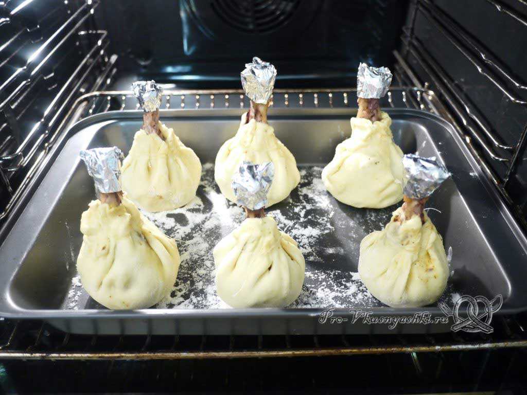 - Для приготовления горячего десерта мешочки следует разместить жаропрочной емкости, залить кремом из сметаны (200 г) с сахарной пудрой (1,5 ст.л.), и затем запекать в духовке 30 минут при 200оС.