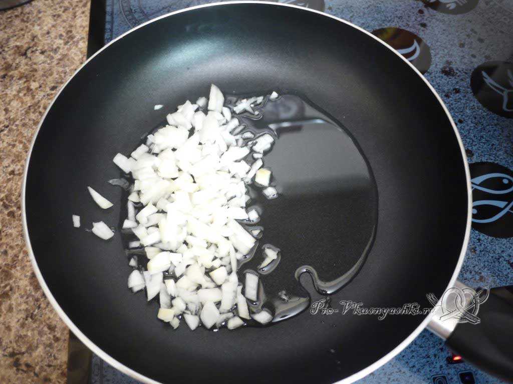 - Репчатый лук (2 головки) шинкуем мелким кубиком и отправляем обжариваться в сковороду на сливочном масле до золотистого оттенка.
