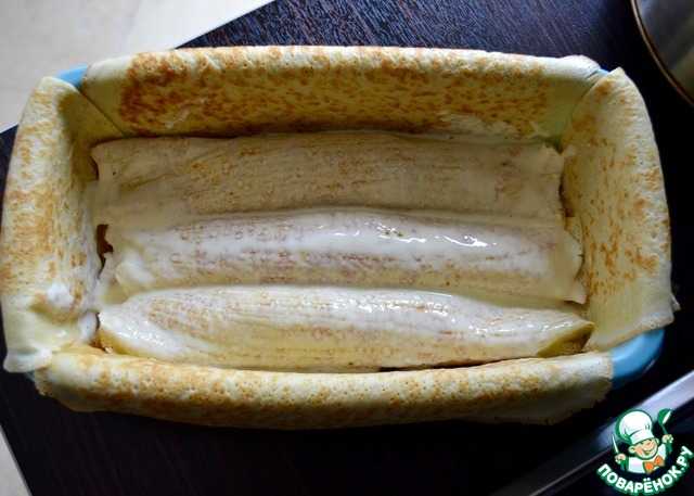Форму для выпечки выложить блинами с четырех сторон так, чтобы края блинов свисали за пределы формы.
