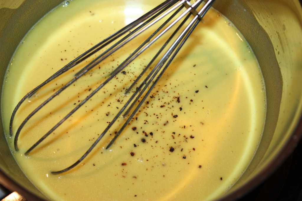 В сотейнике растапливаем масло, всыпаем муку и венчиком перемешиваем, пока содержимое не станет похоже на кашу. Затем, вливаем холодное молоко и постоянно перемешиваем венчиком. Соус должен загустеть до состояния густой сметаны, текстура гладкая. Всыпаем куркуму, соль и перец. Соус готов.