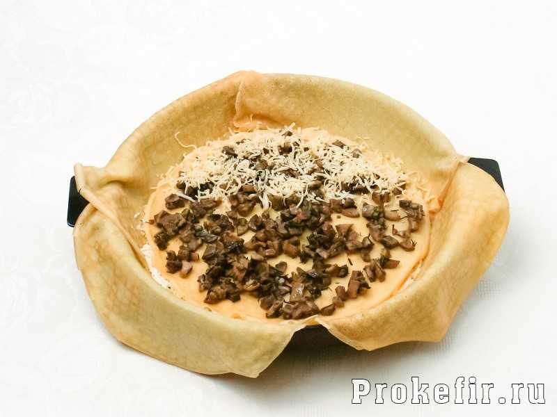 Накрыть этот слой другим блином, на котором разложить грибную начинку. Её также присыпать тёртым сыром.