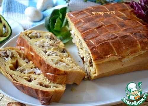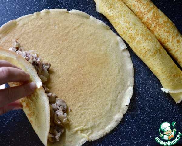 Как приготовить блинный пирог с курицей и грибами и сыром