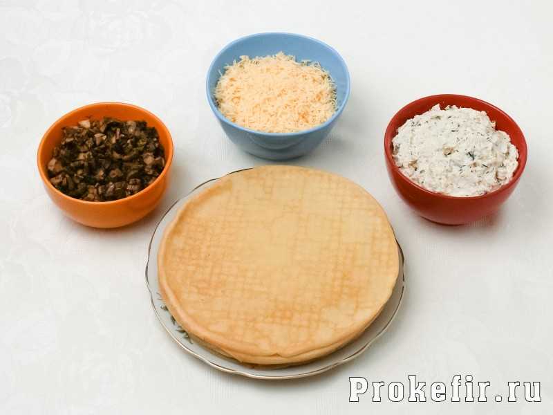 Ингредиенты для блинного пирога с грибами и сыром — это следующие продукты: