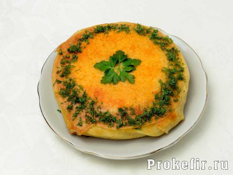 Пирог формируем, чередуя блины и начинку. Сверху должен оказаться блин. Смазываем его оставшейся смесью и посыпаем сыром и укропом, панировочными сухарями и поверх всего выкладываем кусочки сливочного масла. Отправляем в духовку на 15 минут при температуре 200 градусов.