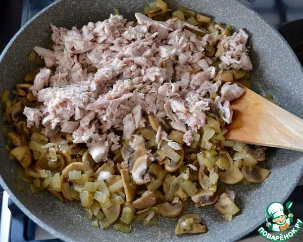 Добавить курицу к грибам и перемешать.
