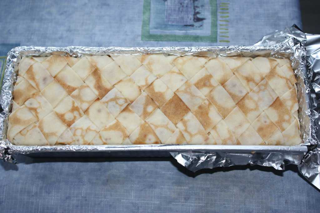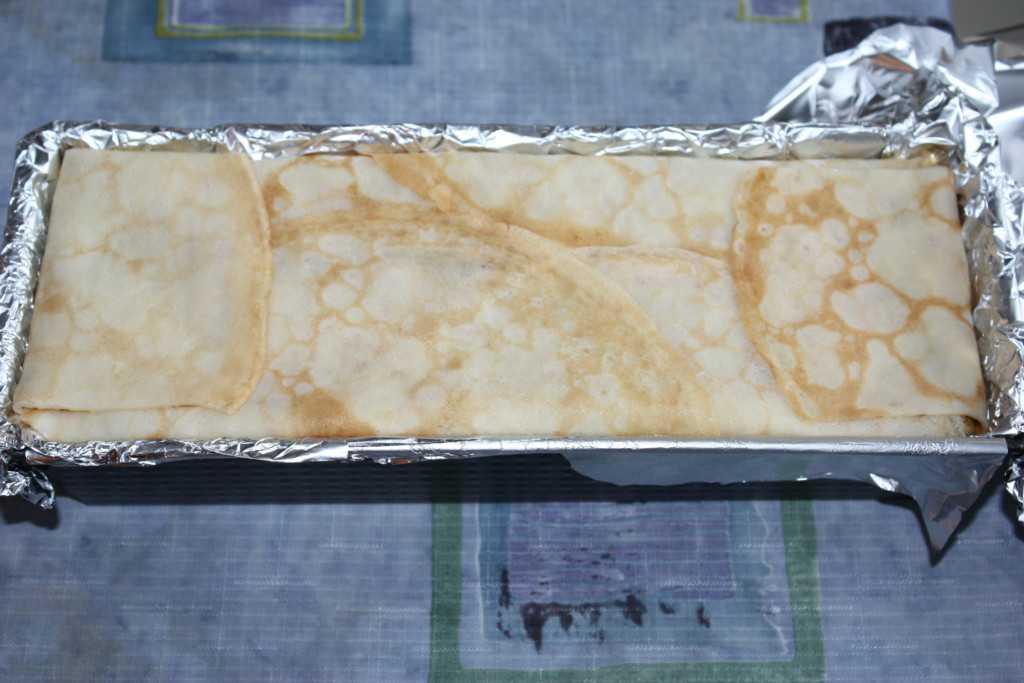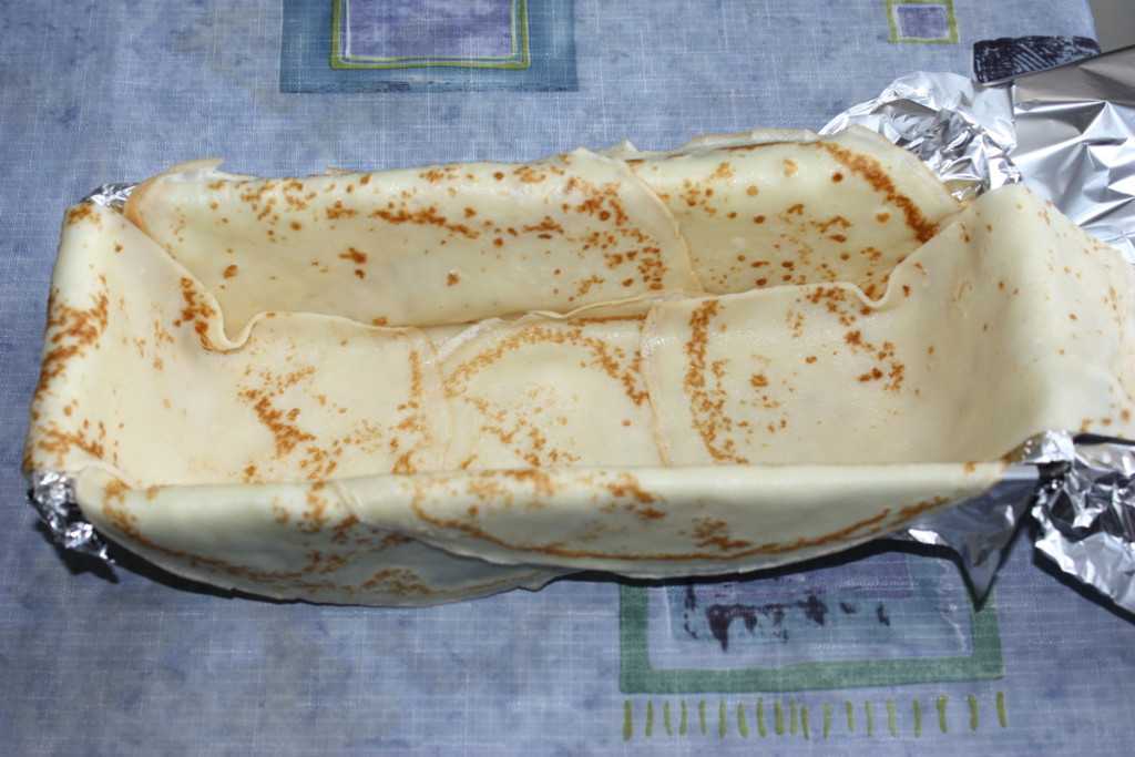 Жаропрочную прямоугольную форму выстилаем фольгой. Затем выстилаем блины так, чтобы они свисали с краев формы, так как мы потом будем ими заворачивать пирог. Блины по центру можно вырезать по размеру формы, что я и сделала.
