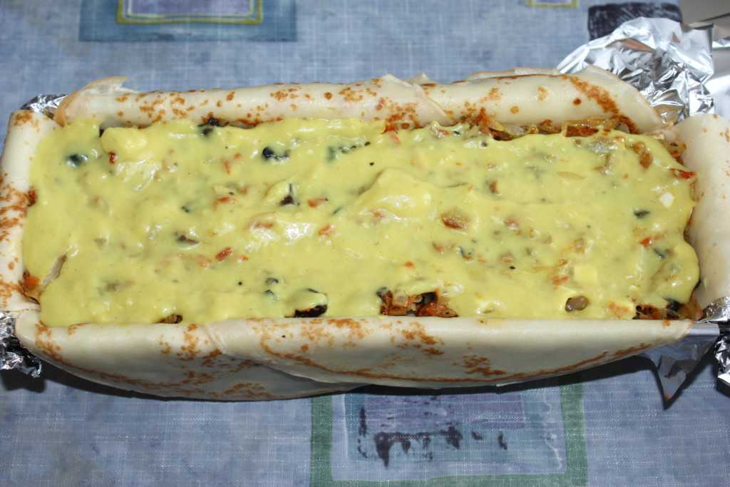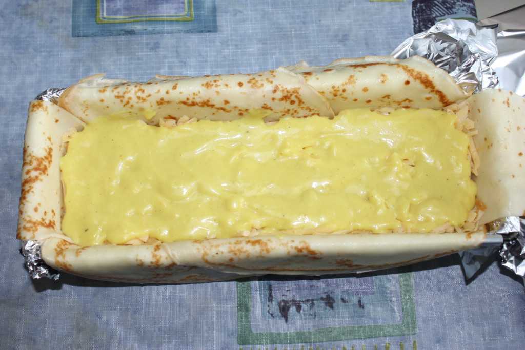 Выкладываем ровно половину начинки, поливаем ее 1/3 частью соуса и накрываем двумя слоями блинов (вырезаем блины прямоугольной формы). Голландский сыр и моцареллу натираем на крупной терке, смешиваем их вместе, выкладываем на блины и заливаем 1/3 частью соуса. И опять закрываем двумя слоями блинов, которые вырезали по размеру формы.