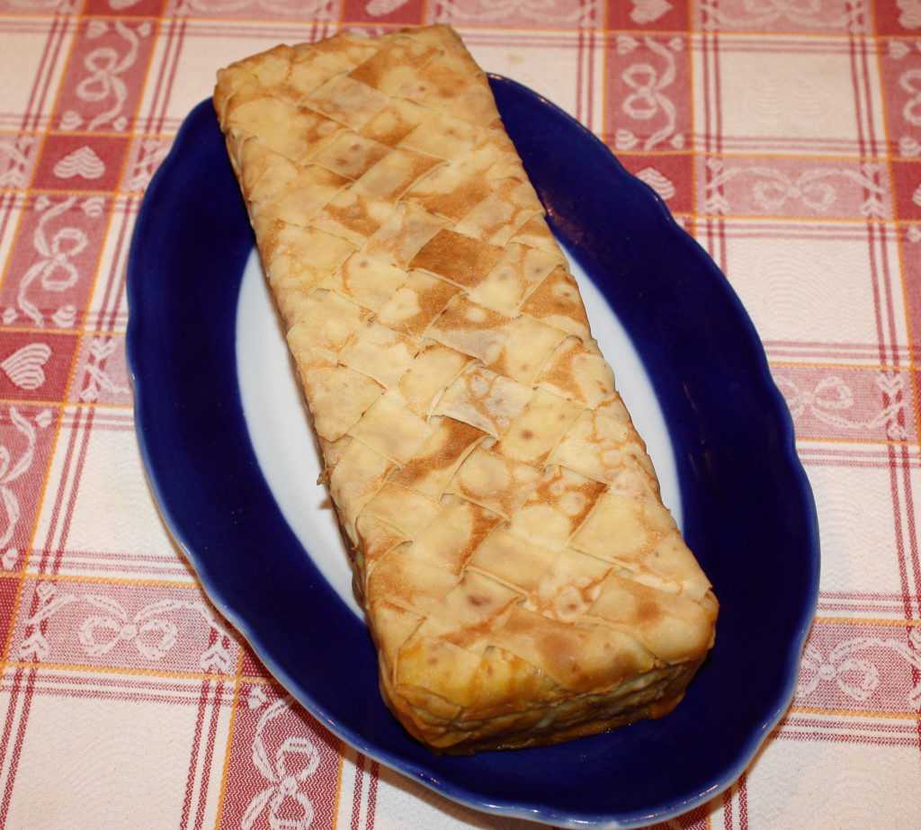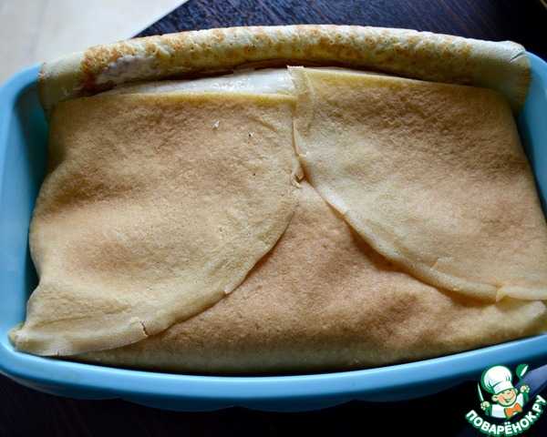 Такую операцию проделать и с остальными блинами и начинкой. Накрыть пирог краями блинов, которые свешиваются с формы. Если их не хватает, чтобы полностью закрыть пирог, сверху можно положить ещё один блин.