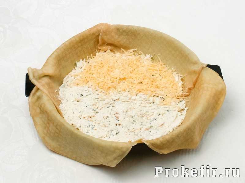 Все компоненты готовы, можно приступать к сборке пирога. Для этого нужно взять форму для выпечки подходящего размера, нагреть её и смазать сливочным маслом. На дно формы выложить первый блин. Ещё 4 блина выложить так, чтобы их края свисали с бортов формы.
