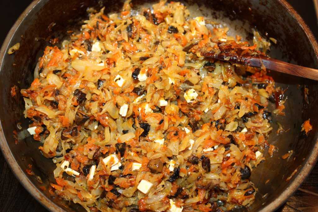 На растительном масле обжариваем лук, нарезанный кубиками, всыпаем к нему морковь, натертую на крупной терке. Следом идет капуста, нашинкованная не крупно, и специи. Все обжариваем до готовности. За минуту до отключения огня добавляем нарезанные грибы и сыр «Сулугуни» на кубики. Начинка для блинного пирога готова. Оставляем ее в сковороде ждать своего часа.