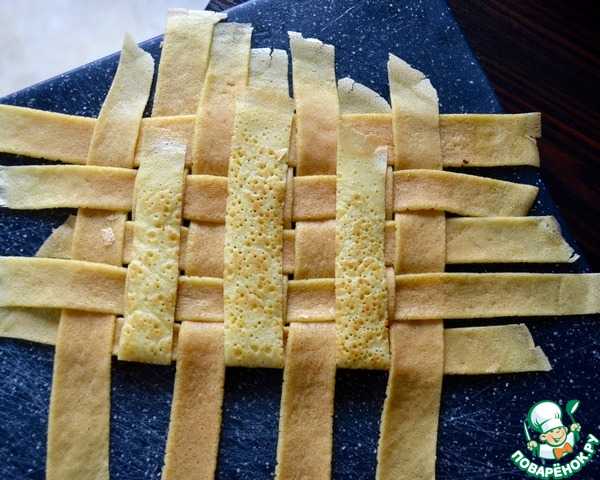 Из оставшихся блинов вырезаем одинаковые по размеру полоски. Набираемся терпения и переплетаем их между собой