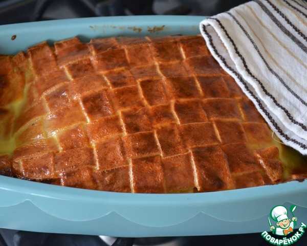 Смазать верх пирога оставшейся заливкой и выпекать пирог в разогретой до 180 градусов духовке около 30 минут, до зарумянивания.