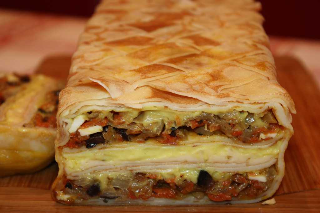 Как приготовить блинный пирог с грибами, сыром и овощами