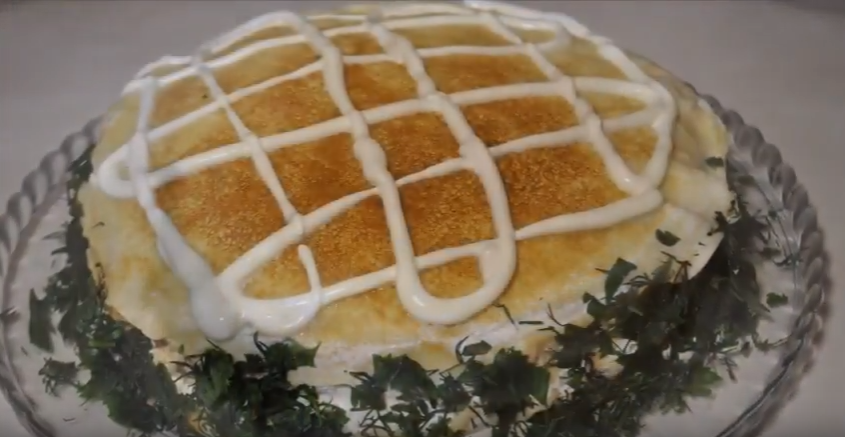 6. Готовую конструкцию заливаем специально оставленным блинным тестом, смешанным с мелкорубленым укропом.