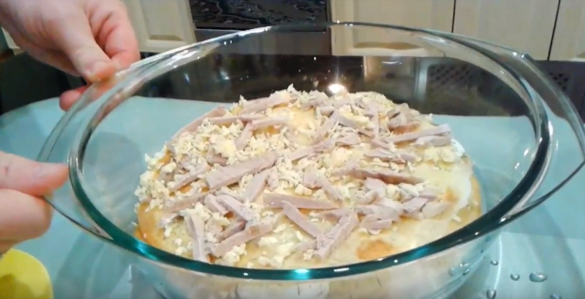 4. В смазанную маслом круглую жаропрочную форму для запекания или в разъемную для бисквитов укладываем 4 блинчика так, чтобы их краешки обязательно свешивались через бортики. На дно кладем еще 1 тонкий съедобный кругляш, чуть приподняв его края. Равномерным слоем распределяем в основе пирога половину куриного мяса.