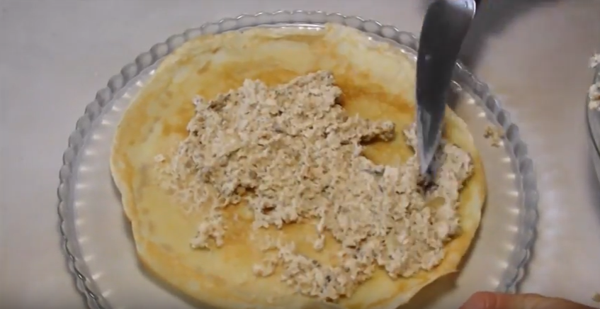 9. Ну а дальше идет простая сборка. На блин мажем начинку, накрываем ее следующим блином и снова кладем начинку. И так пока не кончатся все блины.