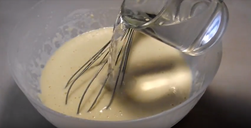 3. Готовим обычное блинное тесто, соединив яйца с молоком, щепоткой соли, ложечкой сахара, содой, маслом (3 ст. л.) и мукой. Чтобы получилась более однородная консистенция, лучше все смешать при помощи миксера.
