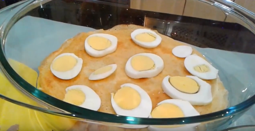 3. Накрываем мясо блином на который выкладываем вареные яйца, нарезанные на тонкие кольца (так удобнее) и снова пересыпаем сыром и специями.