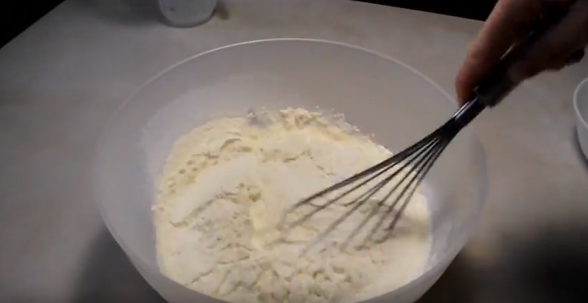 затем добавляем к яйцам постепенно муку с крахмалом и кефир, хорошенько размешиваем, чтобы не было комочков