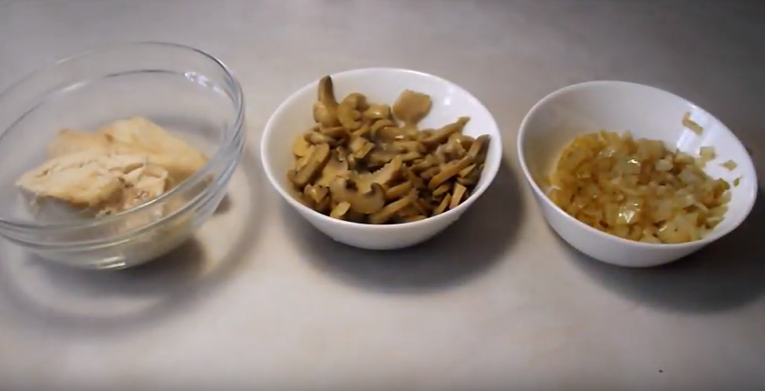 7. Когда блинчики будут готовы, перейдем к начинке. Она состоит из вареной курицы (отварим ее заранее), обжаренного лука (который так же нужно приготовить заранее) и маринованных шампиньонов.