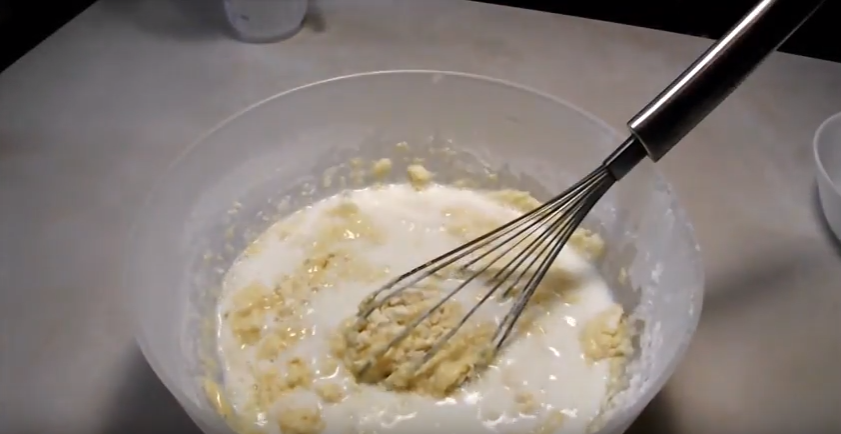 3. Тщательно взбиваем смесь венчиком и, когда все молоко впитается, вливаем вторую его порцию и продолжаем размешивать.