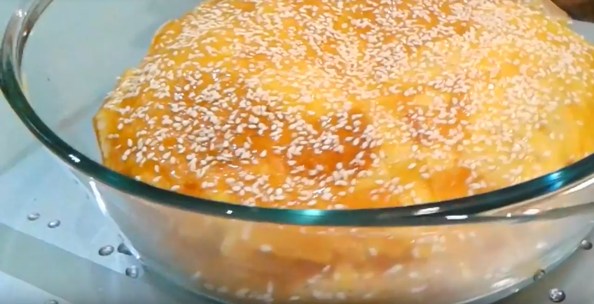 6. Верх пирога щедро смазываем желтком и обсыпаем семенами кунжута (по желанию).