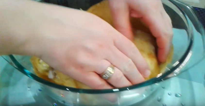 Проделываем данную процедуру с оставшимися двумя блинами, чтобы пирог был закрыт со всех сторон.