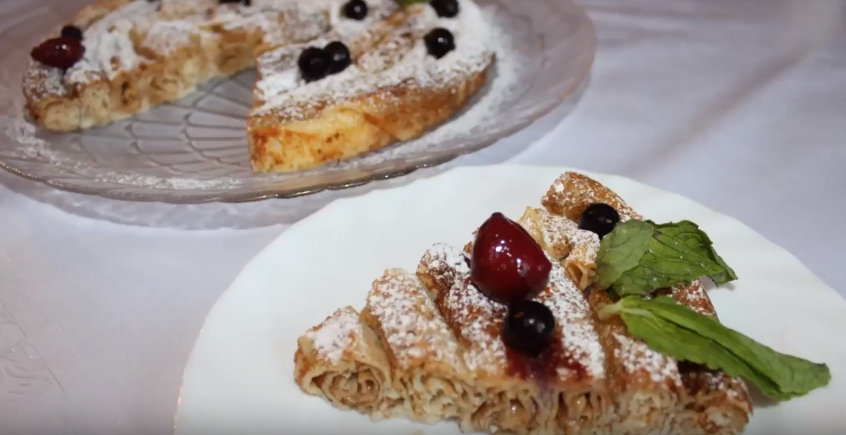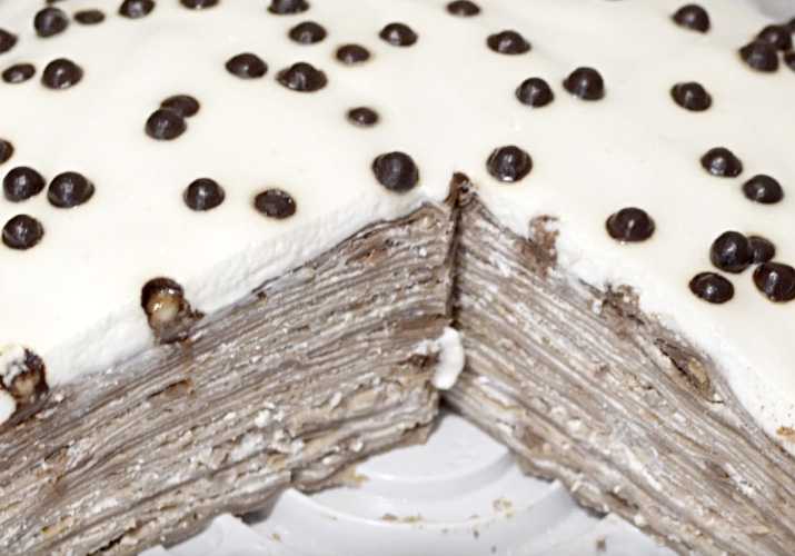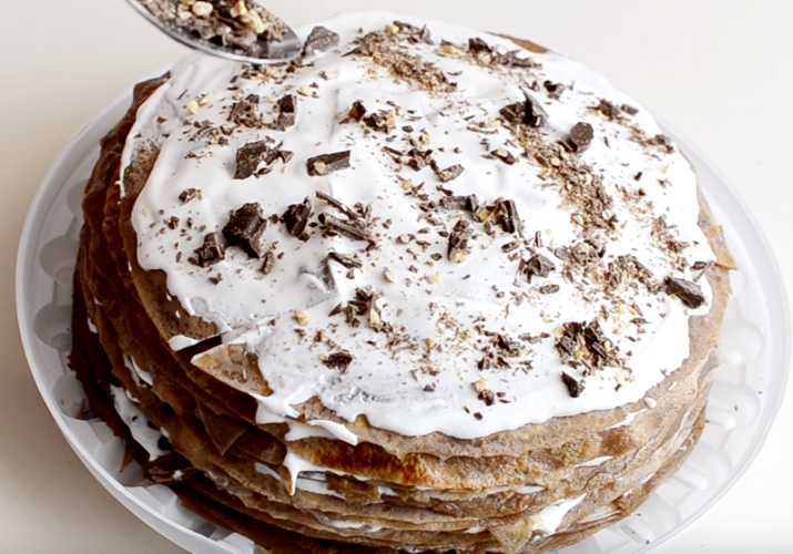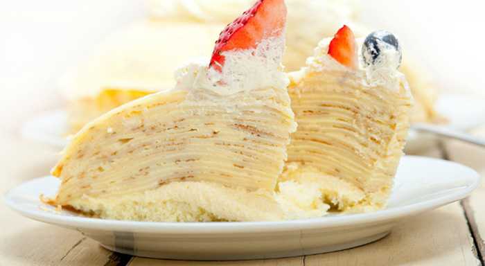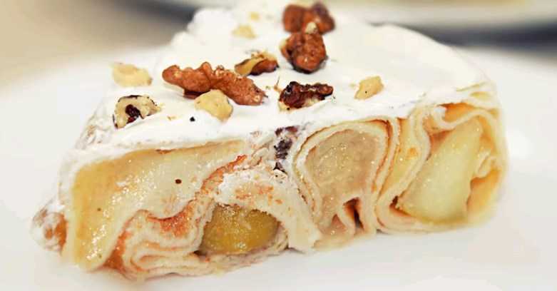 Как мы уже упоминали, в блинный торт часто добавляют разные ингредиенты, что делает его интереснее и необычнее. Одна из наиболее часто используемых добавок – бананы или яблоки. Этот рецепт немного сложнее, но результат оправдает все усилия! К тому же этот рецепт не предполагает запекания в духовке!
