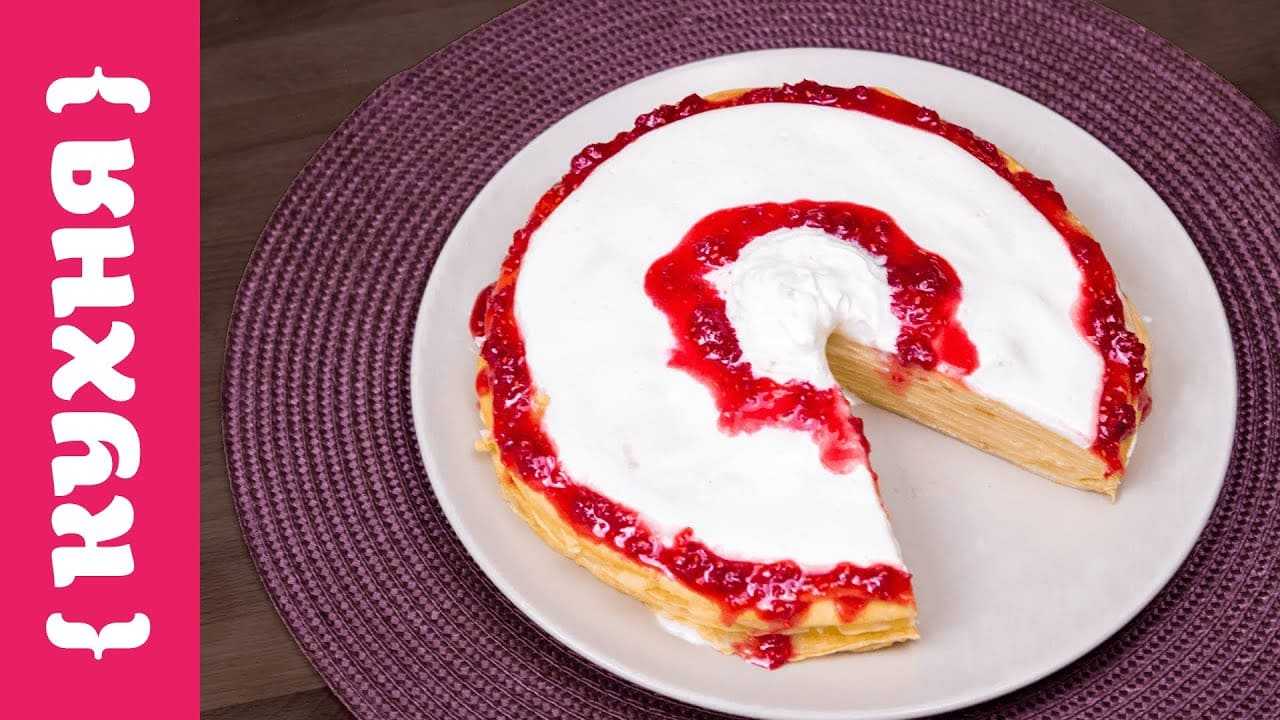 - Украшаем торт. На последний блинчик выложим остатки сметанного крема. С помощью кондитерского мешочка будем выдавливать тонким слоем на торт малиновое варенье. Выдавим варенье по окружности торта и делаем небольшой круг по центру. Теперь берем взбитые сливки и добавляем последний штрих. Торт готов!