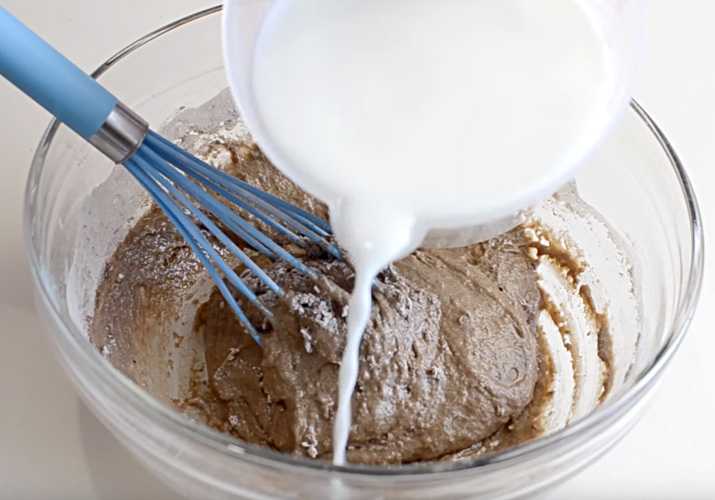 - Начнем плавно вводить молоко и потихонечку засыпаем мукой. Контролируем густоту теста, а также чтобы не было комочков.