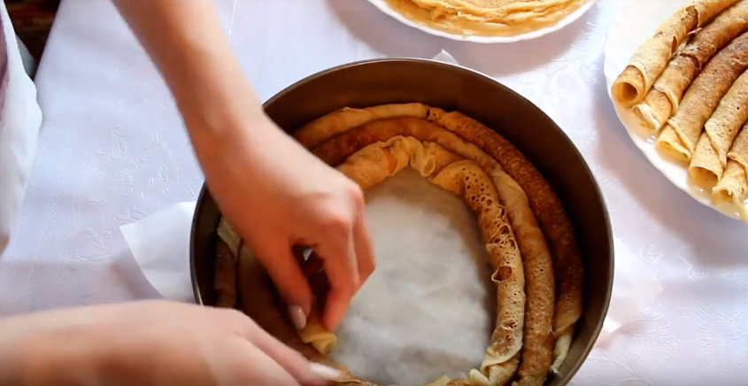 Блины можно испечь заранее. Можно даже заморозить, а в нужный момент достать из морозильной камеры и собрать торт.