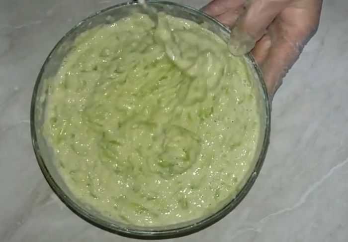 2. В кабачковую массу всыпаем муку, снова вымешиваем. Тесто должно получится по консистенции как густая сметана.