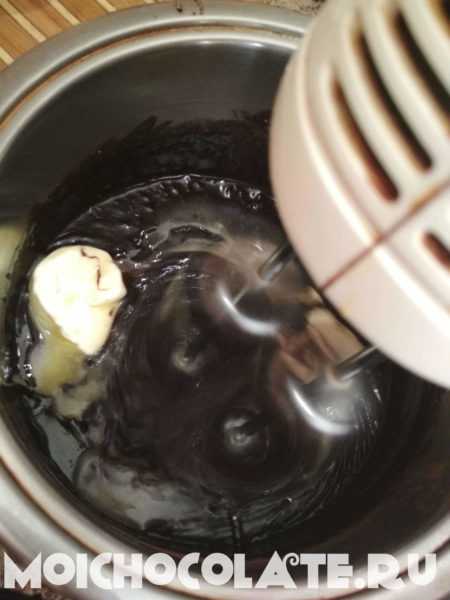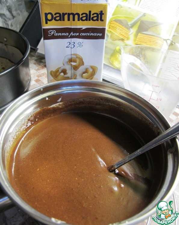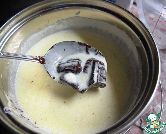 К смеси добавляем наломанный темный шоколад и хорошо перемешиваем до его растворения. Торт покрываем глазурью и снова ставим на холод до застывания.